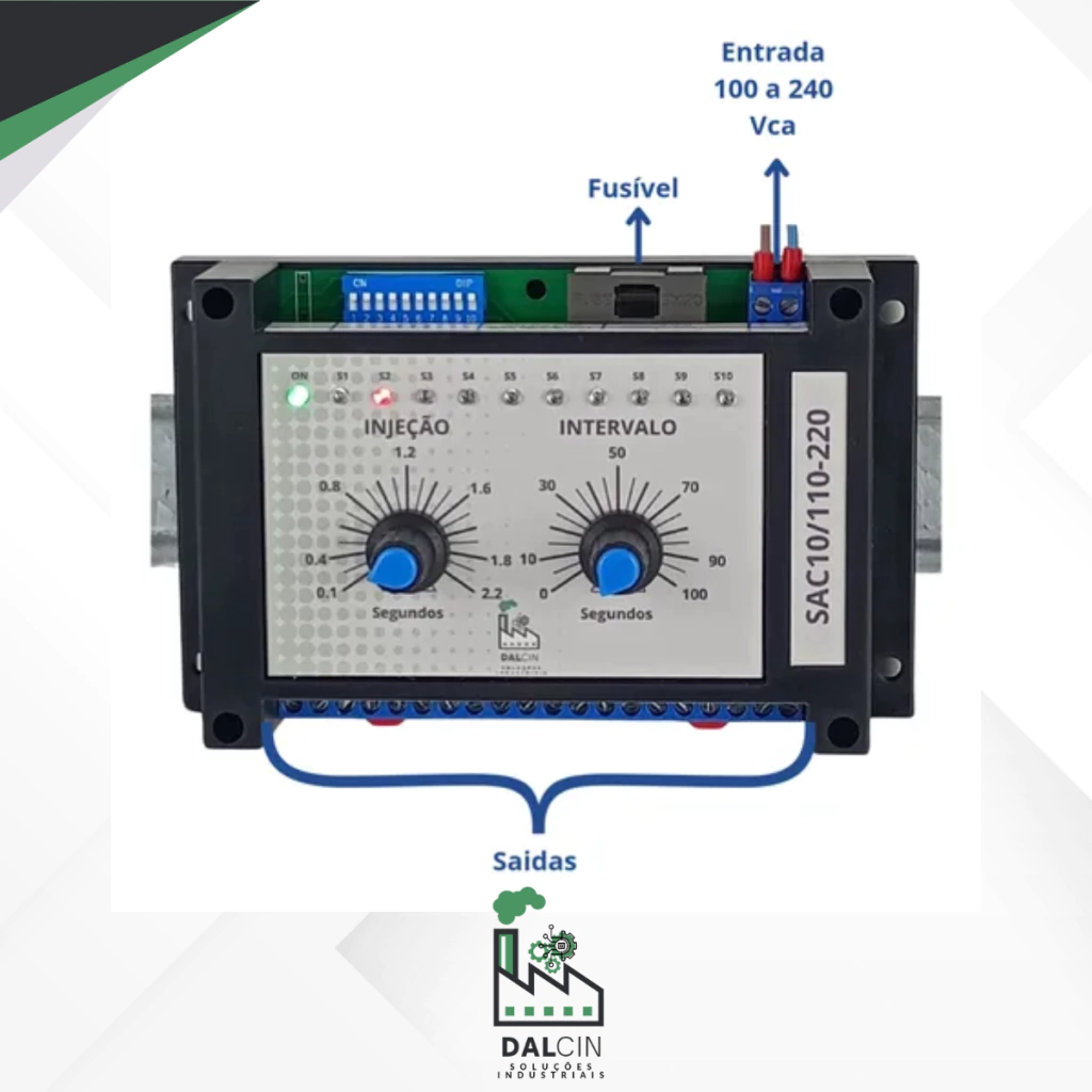 - Faixa de ajuste Tempo permanência (válvula ligada) de 0.1 segundos a 2.2 segundos,